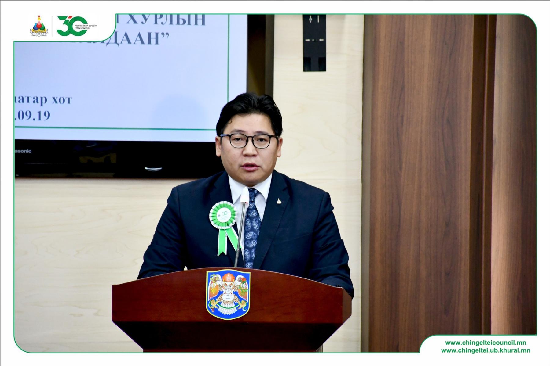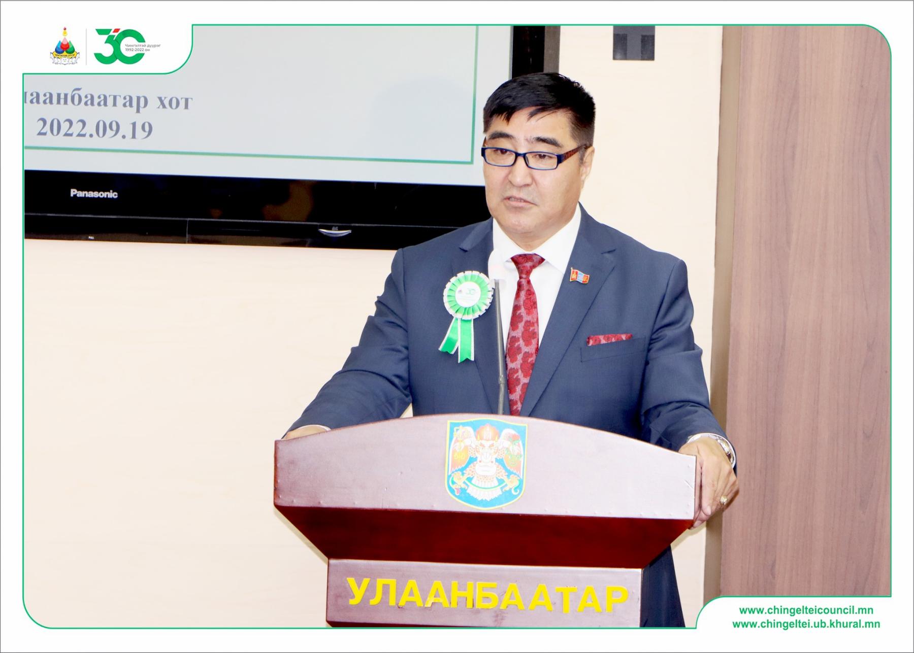 Чингэлтэй дүүргийнхээ хөгжил цэцэглэлтийн төлөө санал санаачилга, идэвх зүтгэл, нөр их хөдөлмөрөө зориулж байдаг иргэдийнхээ дуу хоолой, төлөөлөл болсон дүүргийн иргэдийн Төлөөлөгчдийн Хурлын эрхэм төлөөлөгчид, дүүргийнхээ мянга мянган төрийн албан хаагчид, аж ахуйн нэгж байгууллага, ард иргэддээ чин сэтгэлийн талархал илэрхийлж, Чингэлтэй дүүрэг үүсэн байгуулагдсаны түүхт 30 жилийн ойн баярын мэндийг өргөн дэвшүүлье” хэмээн баярын үг хэллээ.