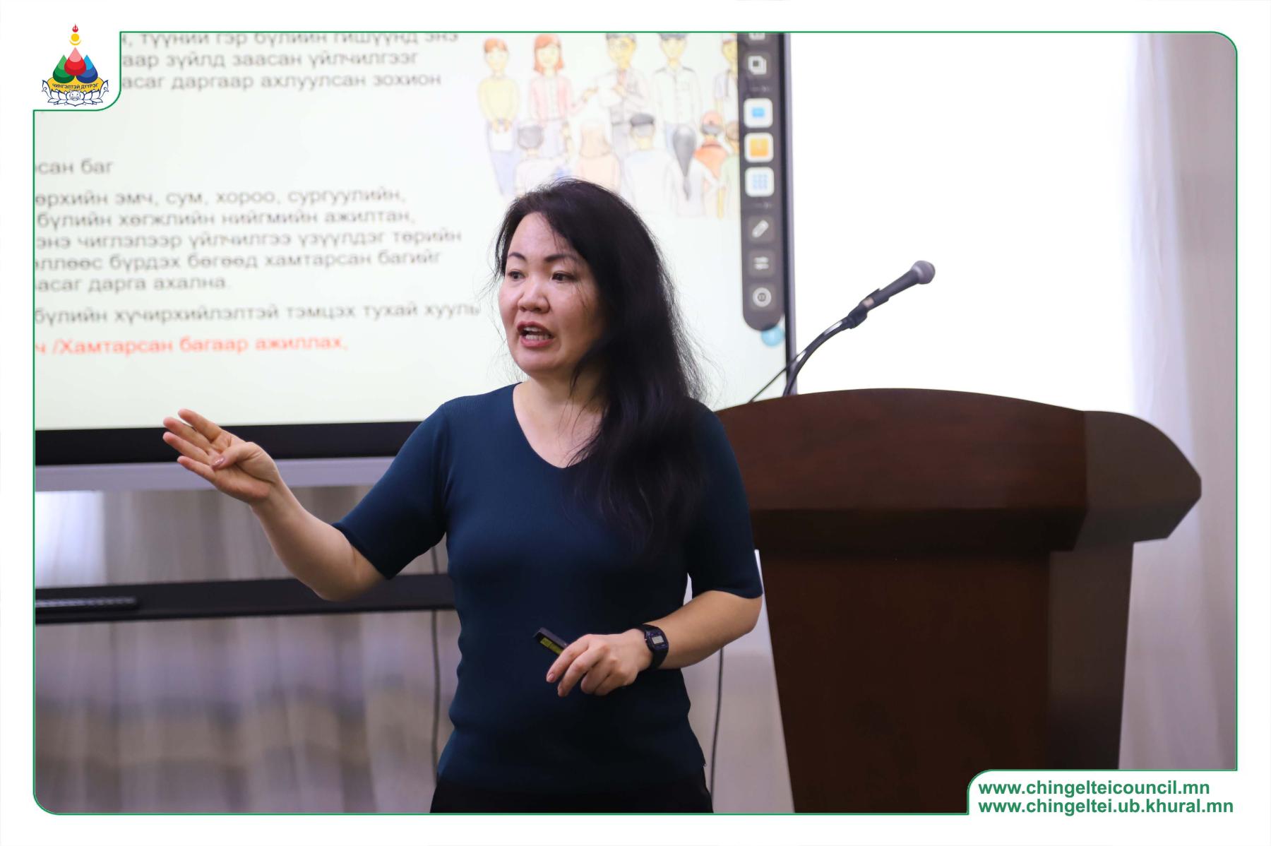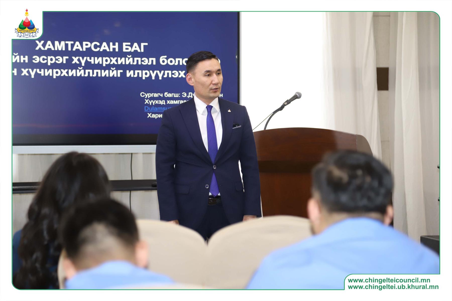 Дүүргийн Гэмт хэргээс урьдчилан сэргийлэх ажлыг зохицуулах салбар зөвлөлөөс хамтарсан багийн гишүүдийг чадавхжуулах сургалт зохион байгууллаа. Ингэхдээ гишүүдийг хариуцсан чиглэл бүрээр нь сургалтад хамруулсан юм. Тухайлбал, хорооны нийгмийн ажилтан, сургуулийн нийгмийн ажилтан, хэсгийн байцаагч, Өрхийн эрүүл мэндийн төвийн нийгмийн ажилтан зэрэг чиглэлээр нь өөр өөр хөтөлбөр боловсруулж, чадавхжууллаа. Хамтарсан багийн гишүүд нь дүүргийн 24 хорооны гэр бүл, хүүхдийн эсрэг хүчирхийллийн урьчилан сэргийлэх, эрт шатанд илрүүлэх, таслан зогсоох, хохирогчийг нөхөн сэргээхэд чиглэсэн цогц үйлчилгээ үзүүлдэг билээ. Энэ утгаараа өөрсдөө чадавхжиж, хууль эрх зүйн шинэчлэлийн мэдээллийг аваад зогсохгүй хувь хүний хөгжил зэрэг бусад ур чадварыг эзэмшсэн байх шаардлагатай юм. Энэ утгаараа уг сургалтыг зохион байгуулсан юм.
