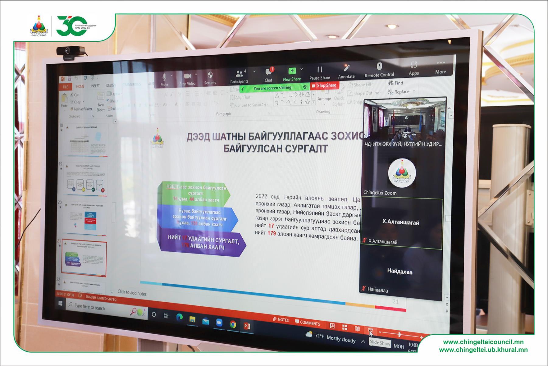 НИЙСЛЭЛИЙН ЧИНГЭЛТЭЙ ДҮҮРГИЙН ИРГЭДИЙН ТӨЛӨӨЛӨГЧДИЙН ХУРЛЫН ЭРХ ЗҮЙ, НУТГИЙН УДИРДЛАГЫН ХӨГЖЛИЙН ХОРОО ХУРАЛДАЖ БАЙНА. /2022.06.27/